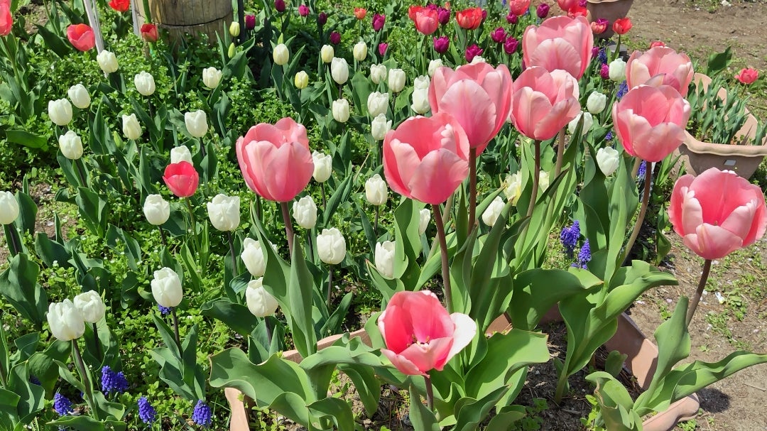 園内のチューリップは、市民団体「庄内チューリップ倶楽部」が育てたもので、約100品種・2万株が開花。昨年6月から10月にかけて、市民ボランティアや保育園児たちが掘り上げ、皮むきや乾燥を行った球根が使われています。入園は無料で、見頃は5月3日ごろまで続く見込みです。