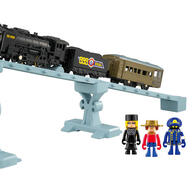 通常のプラレールのレールに乗せて走行時には先頭車両のヘッドライトが点灯する仕掛けを搭載。メーテルや鉄郎、車掌のプラキッズに加え、オリジナルの橋脚やエンドレール、標識などもセットになっている、こだわり満載の商品だ。