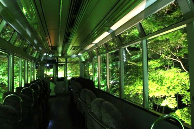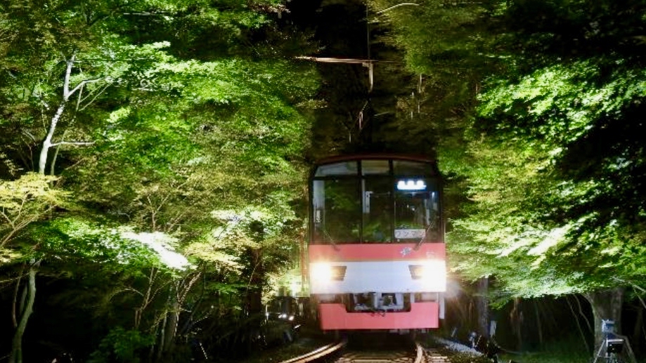 また、今年も貴船神社の「夜間特別ライトアップ」に合わせ、5月2日~5日の4日間、「青もみじ新緑のライトアップ」を実施。例年の「もみじのトンネル」や二ノ瀬駅、貴船口駅に加え、今回は新たに鞍馬駅もライトアップの対象に。トンネル区間を走る列車は車内の照明を落とし、ゆっくりと進みながら幻想的な新緑の風景を演出する。