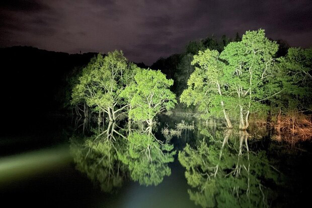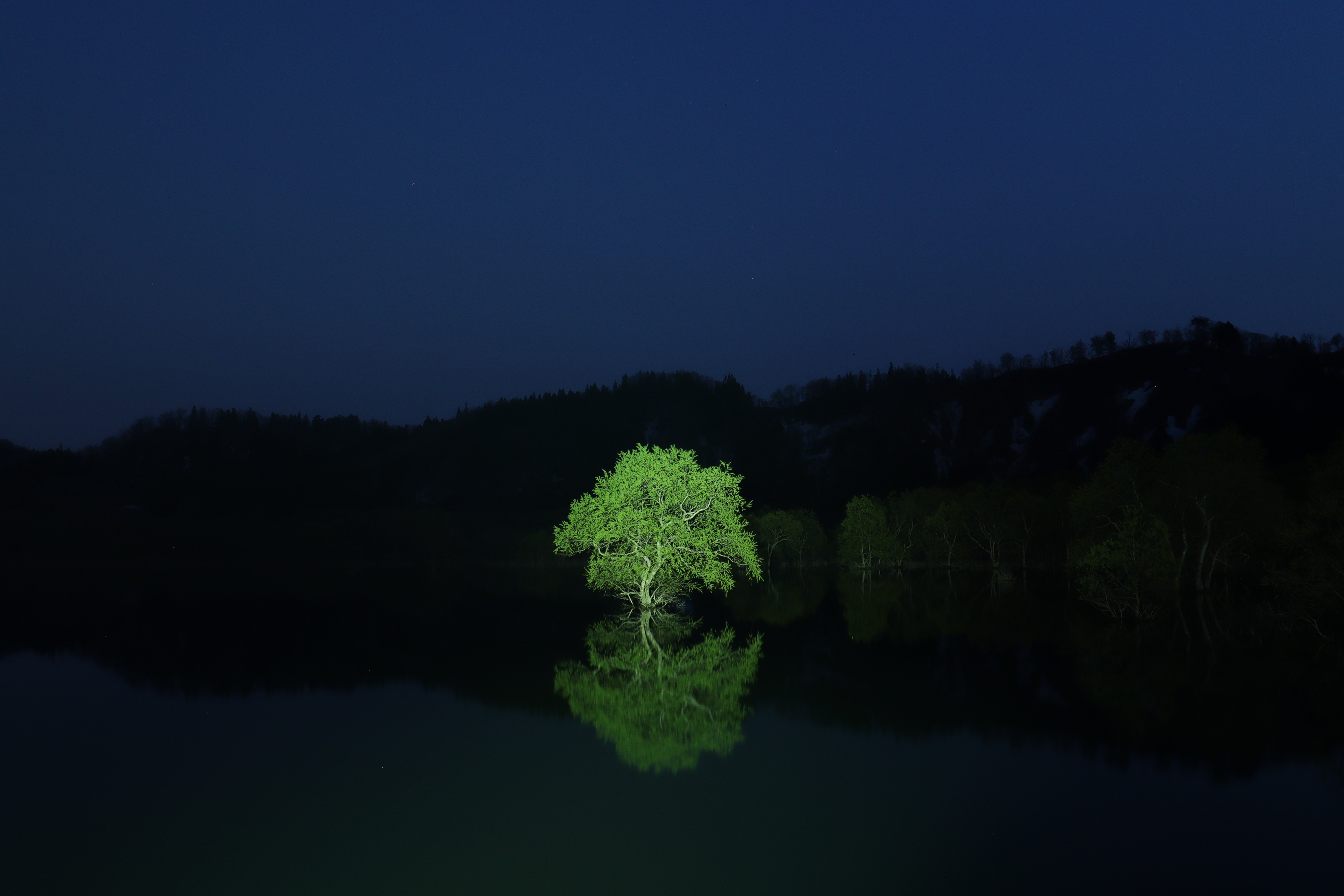 山形県飯豊町の白川湖では、春限定の風景「水没林」が見頃を迎えている。夜になるとライトアップが行われ、水面に浮かぶ木々が闇の中に浮かび上がり、幻想的な雰囲気に包まれる。