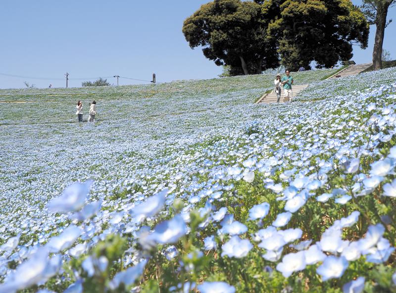 およそ3000平方メートルに広がる花壇は、淡いブルーに包まれた幻想的な光景。青と白が織りなすコントラストが美しく、今の季節ならではのフォトスポットとして人気を集めています。